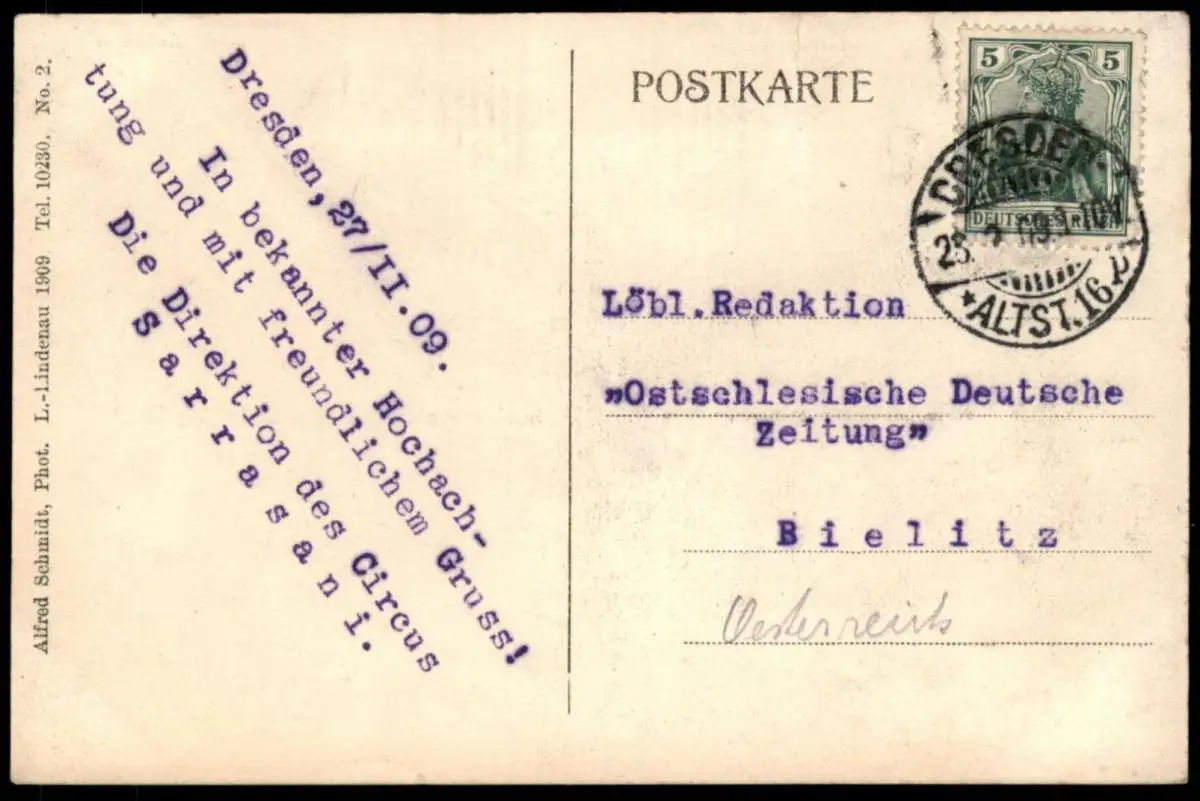 Gelaufen: 28.11.1909 von der Direktion des Circus Sarrasani an die Ostschlesische Deutsche Zeitung in Bielitz mit Stempel DresdenErhaltung (s. Scan): gut, oben minimaler Einriss / 917218