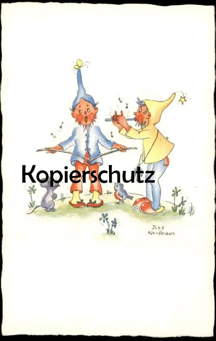 ALTE POSTKARTE ZWERG SPIELT FLÖTE WÜNSCHELRUTE ZWERGE SIGN. ILSE NORDHAUS MAUS VOGEL flute dwarf nain midget postcard AK