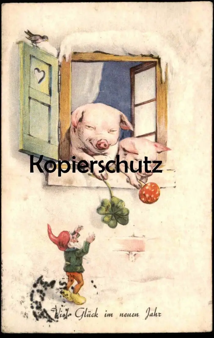 ALTE POSTKARTE ZWERG & SCHWEIN VIEL GLÜCK IM NEUEN JAHR dwarf midget nain pig cochon Fliegenpilz Ansichtskarte postcard