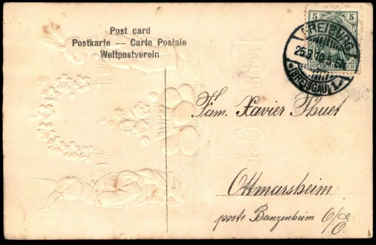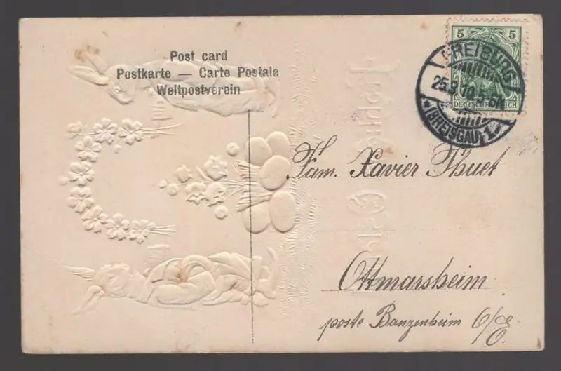 Gelaufen: 25.03.1910 mit Stempel Freiburg nach Ottmarsheim