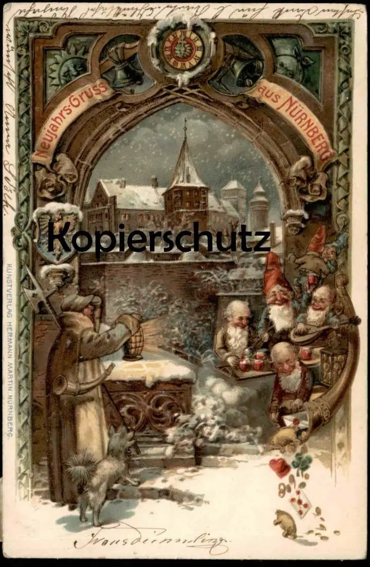 ALTE WINTER LITHO PRÄGE POSTKARTE NEUJAHRS-GRUSS AUS NÜRNBERG ZWERGE Zwerg nain midget dwarfs Neujahr Nachtwächter AK
