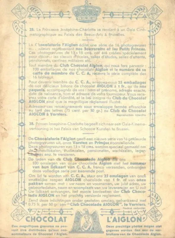 ALTES FOTO PRINCESSE JOSEPHINE-CHARLOTTE GALA CINÉMATOGRAPHIE BRUXELLES BELGIQUE CHOCOLAT L'AIGLON 19 cm x 14 cm photo