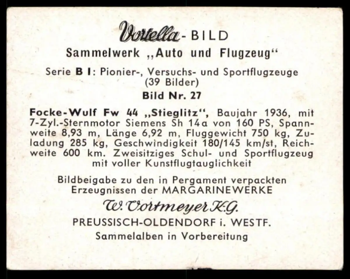 ALTES SAMMELBILD VORTELLA-BILD FOCKE-WULF Fw 44 STIEGLITZ BAUJAHR 1936 W. VORTMEYER PREUSSISCH-OLDENDORFMaße: 7,5 cm x 5,9 cm