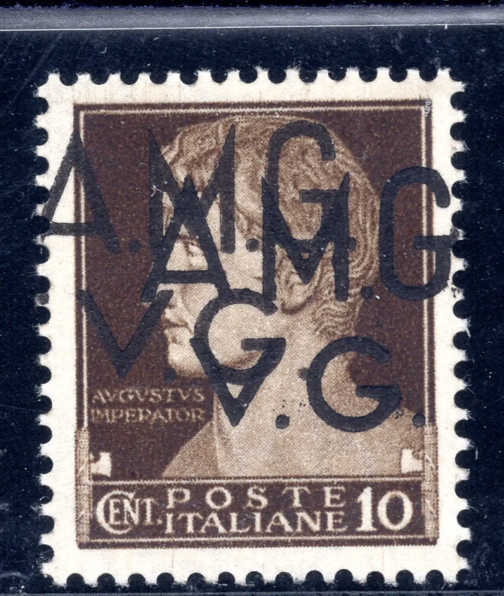 AMG. Sehr guter Zustand. - Cent. 10 Doppel-Vollgummi-Aufdrucke - AMG. Sehr guter Zustand. - Cent. 10 n. 1und Doppelaufdruck, davon einer stark nach links und einer nach rechts verschoben - Kat. 550 Code 750/11