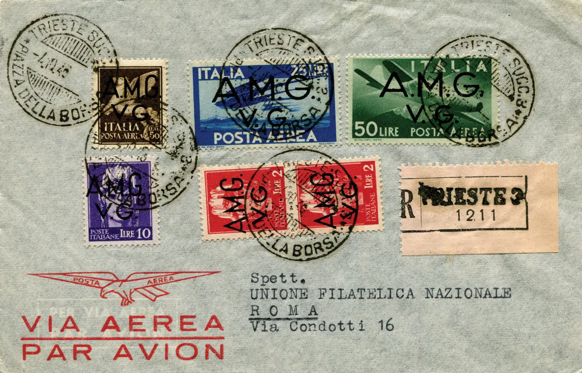 AMG. Sehr guter Zustand. - Luftpost Lire 50 + Ergänzungen auf Umschlag - AMG. Sehr guter Zustand. - Luftpost Lire 50 Nr. 8 + Zusatzpost Nr. 9 Paar + Nr. 11 + P.A. Nr. 1 + 6 auf Umschlag Racc. von Triest nach Rom am 4.10.46 - Schön und ungewöhnlich Cod. 1004/14