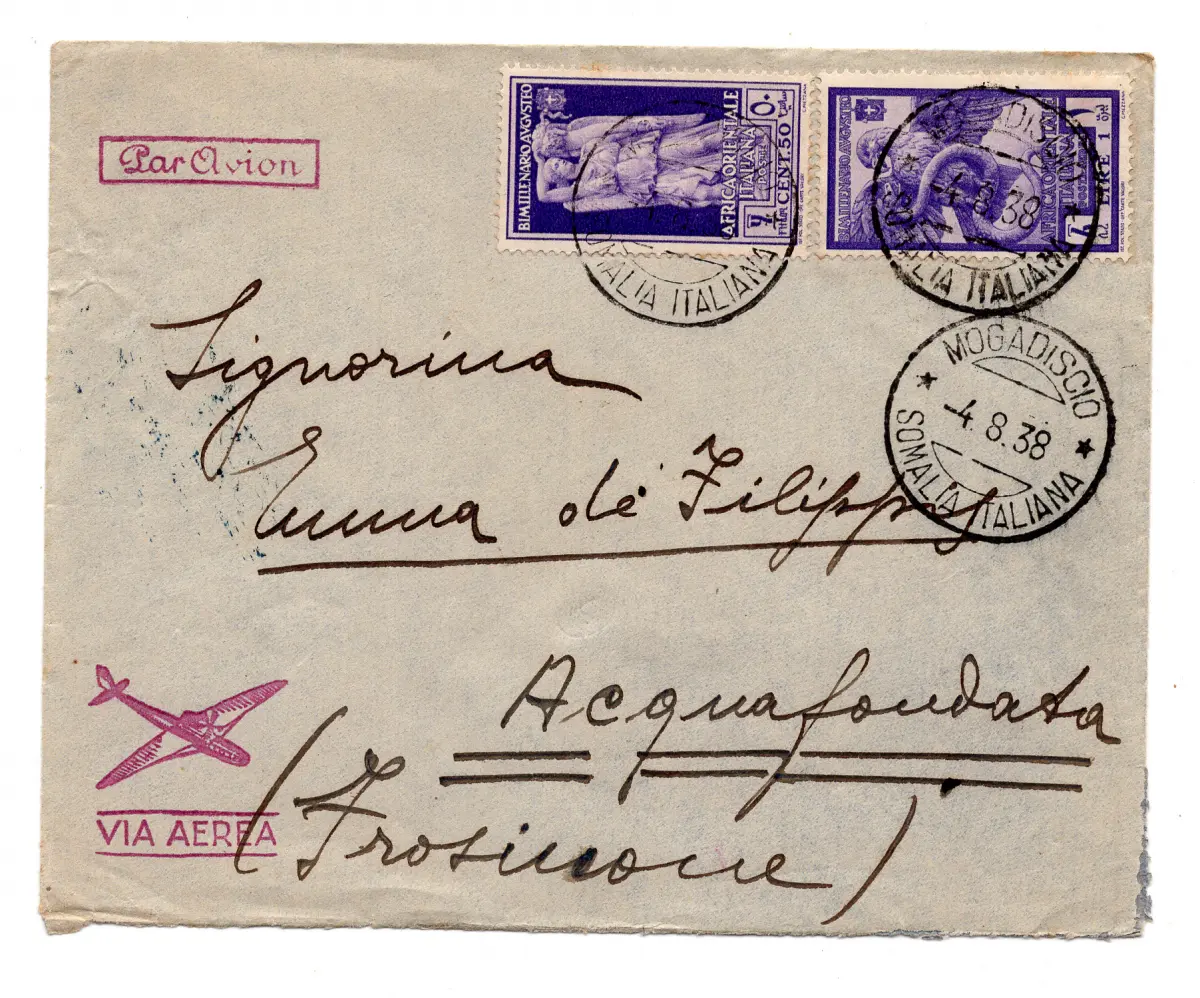 Umschlag - A.O.I. - Augusto Posta Aerea 1 Lira Nr. 15 + Zusatzpost Nr. 24 auf Umschlag auf dem Luftweg von Mogadischu nach Acquafondata am 4.8.38 - Ungewöhnlich, im Katalogtarif Euro260 Cod.2218/WEB