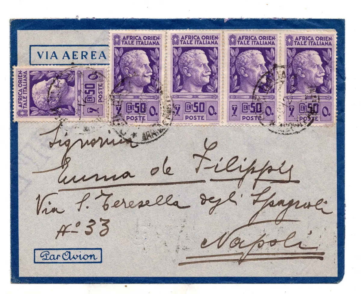 Umschlag - A.O.I. - Cent. 50 Nr. 10 fünf Exemplare auf Luftumschlag nach Neapel am 3.12.38 - Ungewöhnliche Mehrfachverwendung EuroN.C Katalog. Cod.2221/WEB