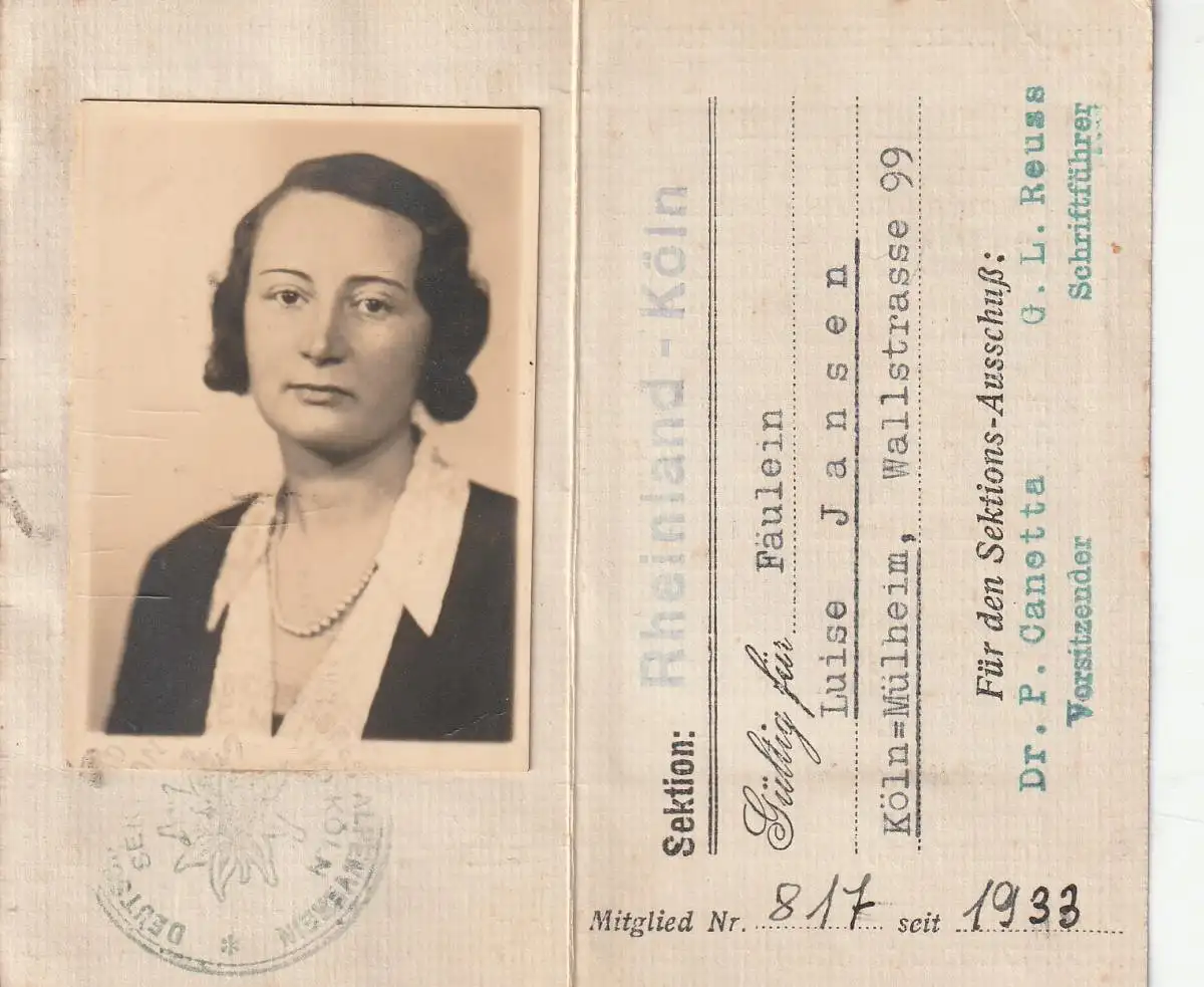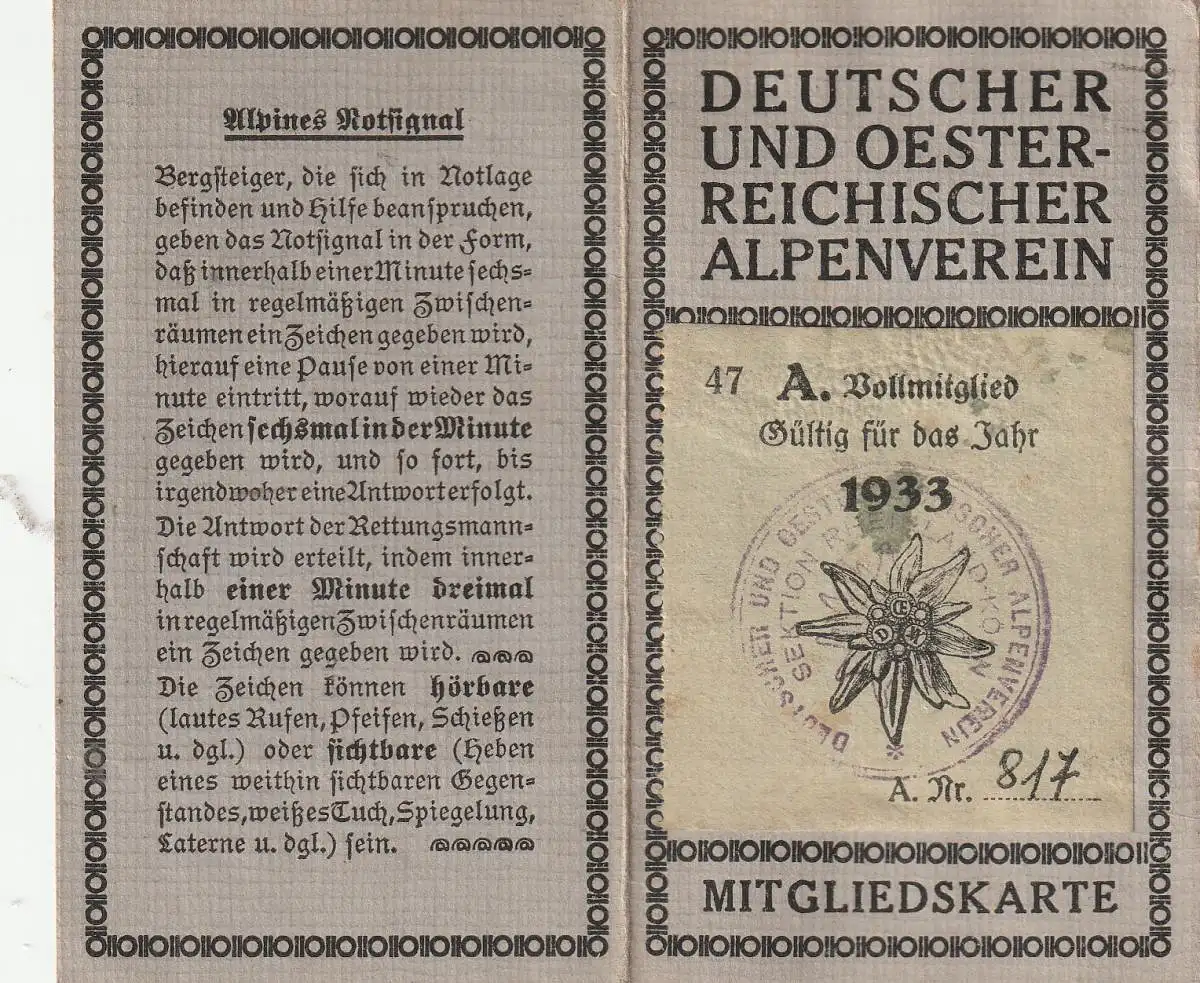 Mitgliedsausweis Deutsch - & Österreichischer Alpenverein, Vollmitglied 1933, Sektion Rheinland - Köln