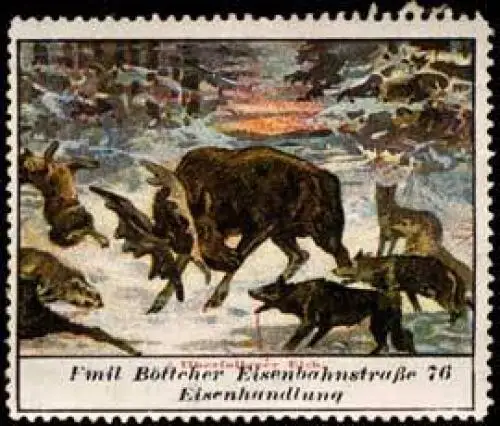 überfallener Elch, Jagd, Wolf, Größe/Zustand: 5x6 , guter Zustand, Original alte Reklamemarke die seinerzeit für die Werbung benutzt wurde