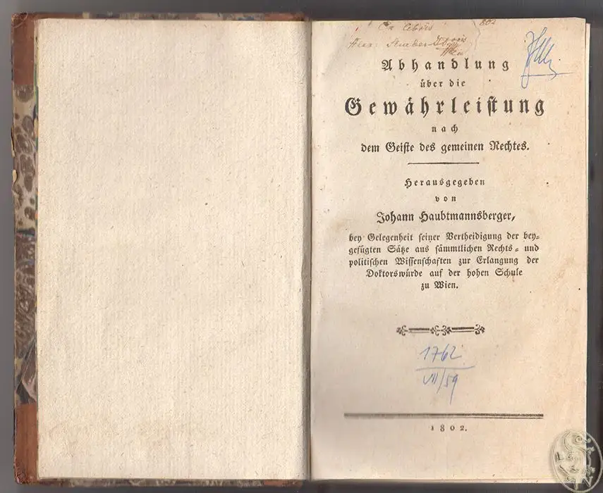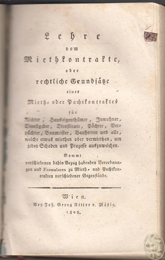 Bemerkungen: Beigebunden: 1.: [HOFMANN, Johann]. Lehre vom Miethkontrakte, oder rechtliche Grundsätze eines Mieth- oder Pachtkontraktes für Richter, Hauseigenthümer, Inwohner, Dienstgeber, Dienstleute, Pächter, Verpächter, Baumeister, Bauherren... Wien, Georg Ritter v. Mösler 1808. VIII, 102 S. - 2.: HANNAMANN, Octavian August. Über die Gränzlinie zwischen Verbrechen und Vergehen. Wien, Gassler 1805. 61 S. - 3.: PROCHAHSKA, Johann Andreas. Das Justizreferat oder Bemerkungen über die Ausarbeitung der Aufsätze in rechtlichen Gechäften, besonders der Prozesse, zum künftigen Vortrage. Prag, Caspar Widtmann 1806. 2 Bll., 74 (1) S. - 4.: GEBHARDT, Carl. Ueber den Unterschied zwischen Servituten und Zwangs- und Bann-Gerechtigkeiten. Lpz., Heinrich Richter 1807. IV, 62 S.