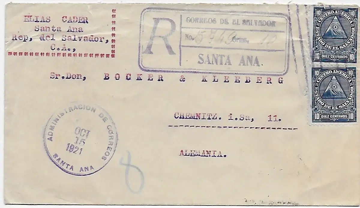 Administration Santa Ana, Einschreiben nach Chemnitz, 1921