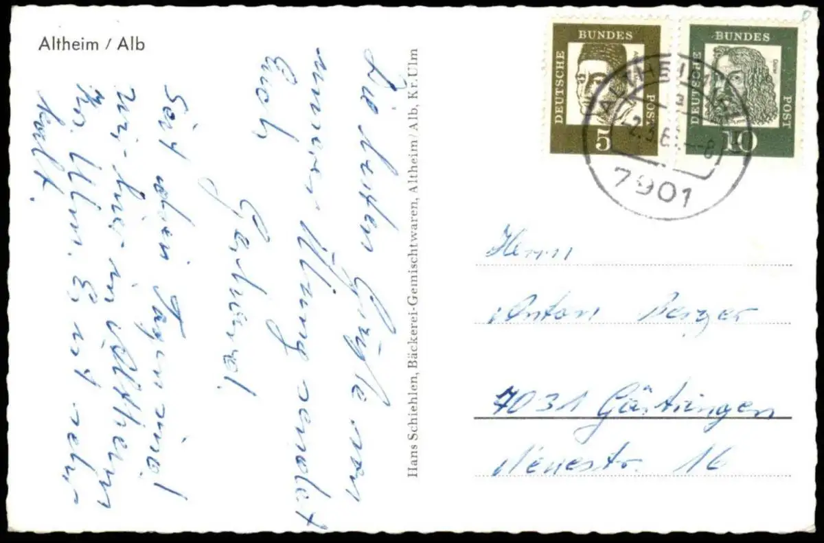 Gelaufen: 02.03.1963 mit Stempel Altheim Alb nach Gärtringen
