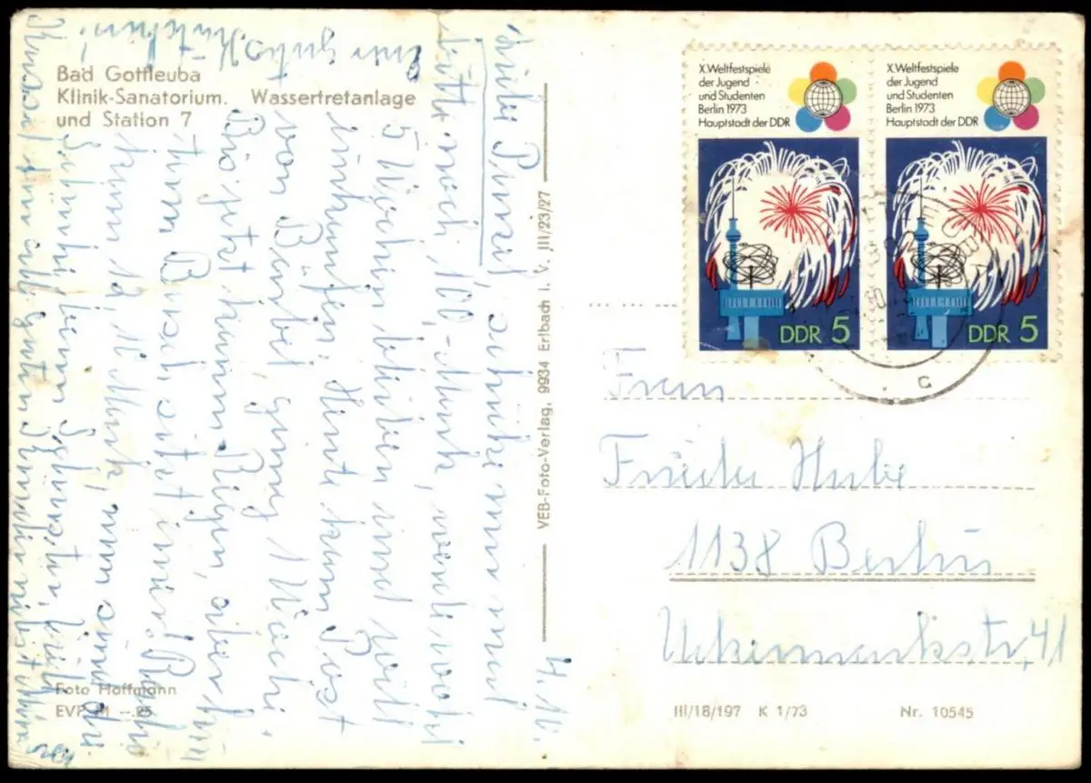 Gelaufen: 04.10.1973 mit Stempel Gottleuba nach Berlin sowie zweimal Briefmarke X. Weltfestspiele der Jugend und Studenten Berlin 1973 Hauptstadt der DDR