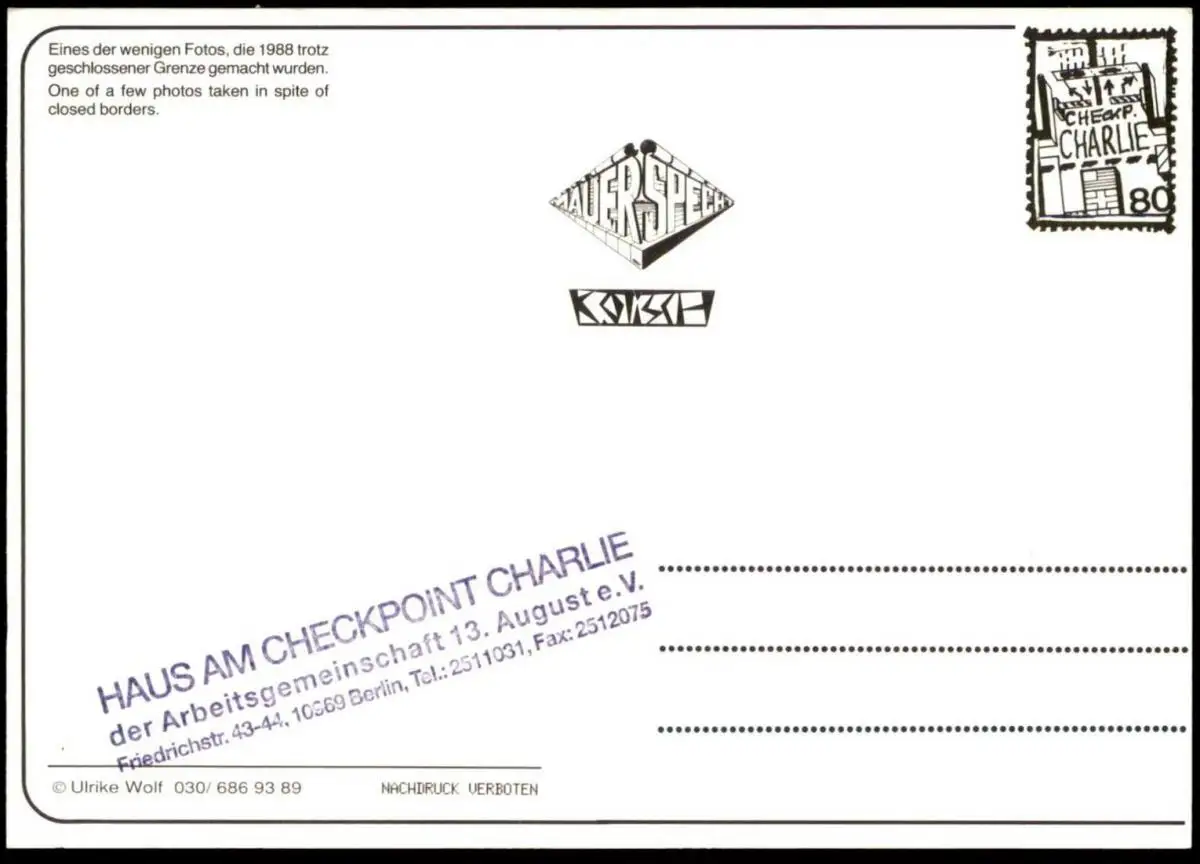 ÄLTERE POSTKARTE BERLIN DIE MAUER EINES DER WENIGEN FOTOS, DIE 1988 TROTZ GESCHLOSSENER GRENZE GEMACHT WURDEN. STEMPEL HAUS AM CHECKPOINT CHARLIEVerlag: Ulrike Wolf, Berlin