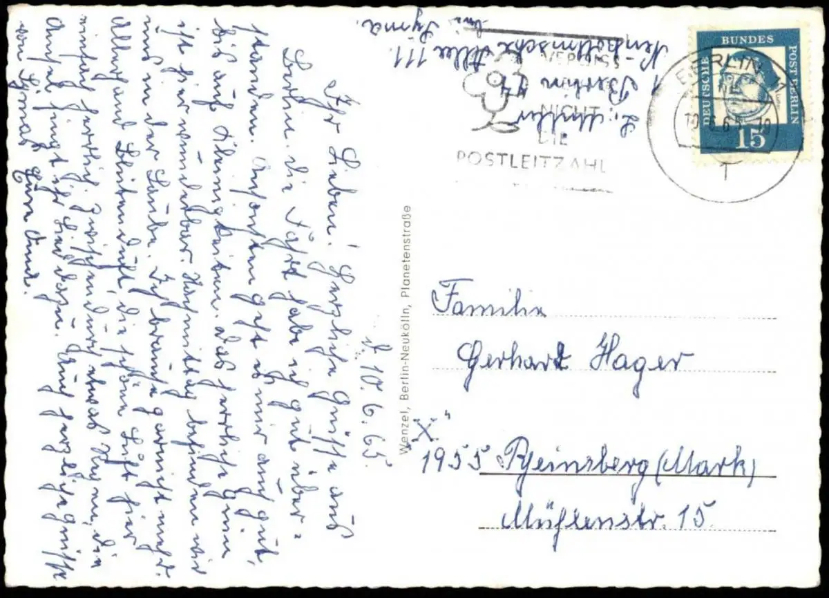 Gelaufen: 10.06.1963 mit Stempel Berlin sowie Vergiss nicht die Postleitzahl nach Rheinsberg MarkErhaltung (s. Scan): gut / 917893