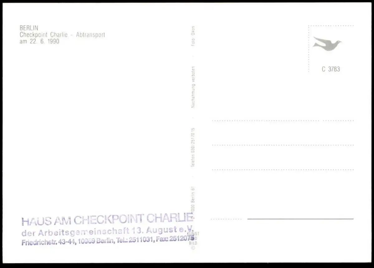 ÄLTERE POSTKARTE BERLIN TSCHÜSS CHECKPOINT CHARLIE ABTRANSPORT 22.06.1990 BERLINER MAUER LE MUR THE WALL american flag