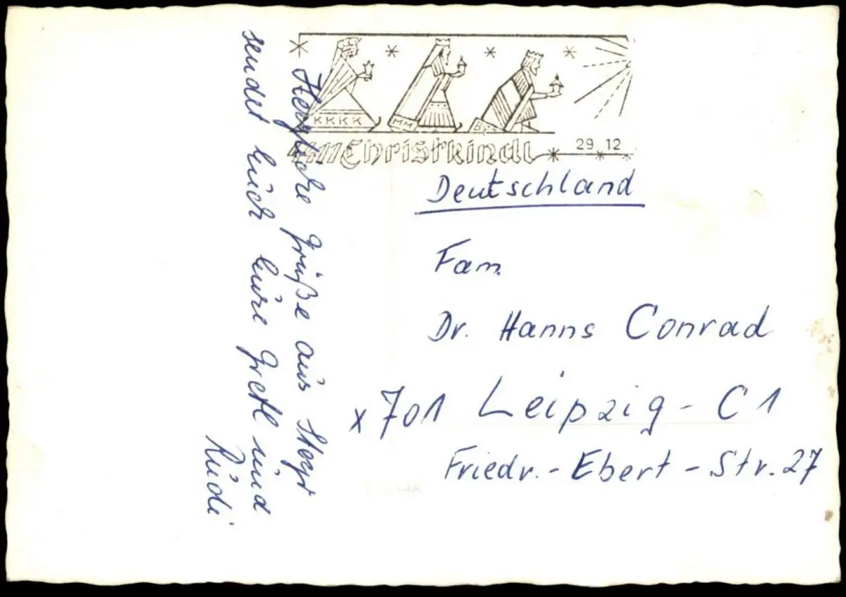 Gelaufen: 29.12.19xx mit Stempel Christkindl nach Leipzig, Briefmarke (relativ sauber) entfernt