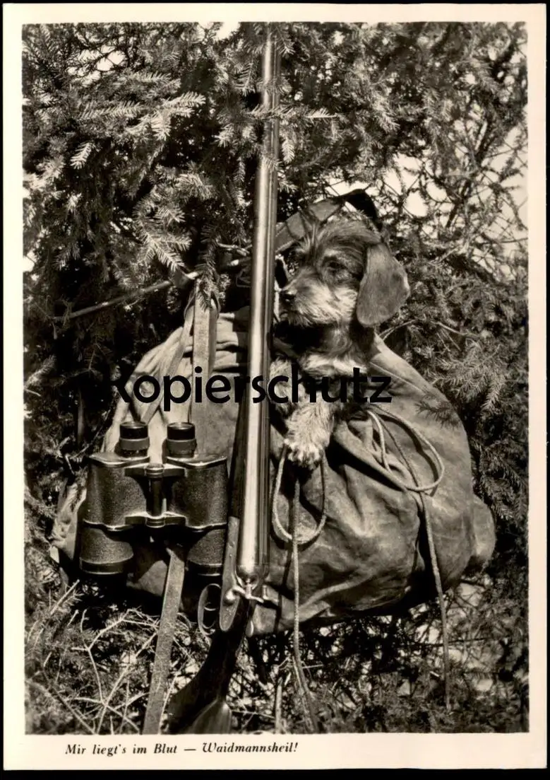 ÄLTERE POSTKARTE DACKEL IM RUCKSACK FLINTE JAGD GEWEHR & FERNGLAS MIR LIEGT´S IM BLUT WAIDMANNSHEIL 30 JAHRE DACKELZUCHT KATHIE DORFMEISTER GERGWEIS-VILS