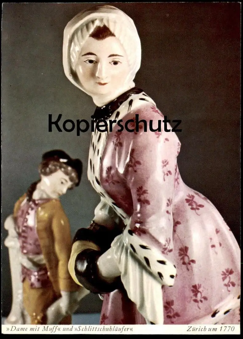 ÄLTERE POSTKARTE DAME MIT MUFF UND SCHLITTSCHUHLÄUFER ZÜRICH UM 1770 MEISSENER PORZELLAN Meissen porcelain saxe postcard