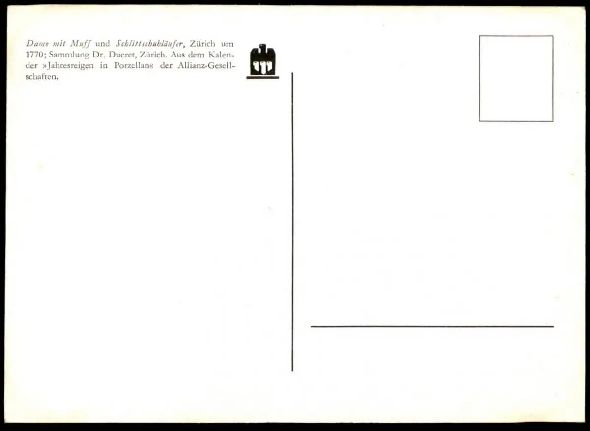 ÄLTERE POSTKARTE DAME MIT MUFF UND SCHLITTSCHUHLÄUFER ZÜRICH UM 1770 SAMMLUNG DR. DUCRET, ZÜRICH AUS KALENDER JAHRESREIGEN IN PORZELLAN DER ALLIANZ GESELLSCHAFTEN