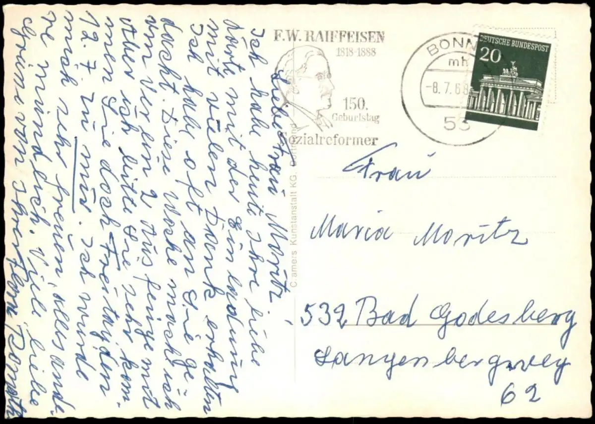Gelaufen: 08.07.1968 mit Stempel Bonn und Maschinenwerbestempel “F. W. Raiffeisen 150. Geburtstag Sozialreformer 1818-1888”