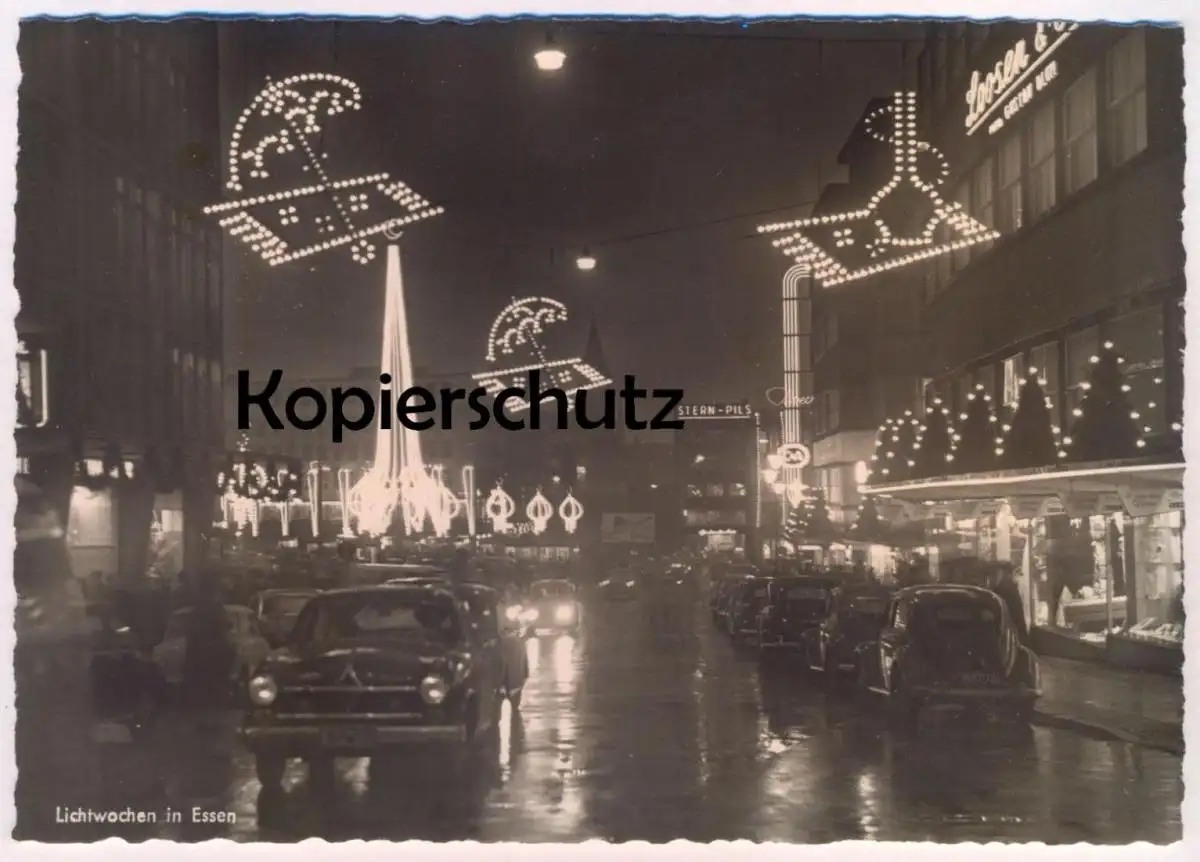 ÄLTERE POSTKARTE ESSEN LICHTWOCHEN 1956 C & A GESCHÄFT BORGWARD ISABELLA VW VOLKSWAGEN KÄFER STERN PILS LOOSEN & CO. GUSTAV BLUM