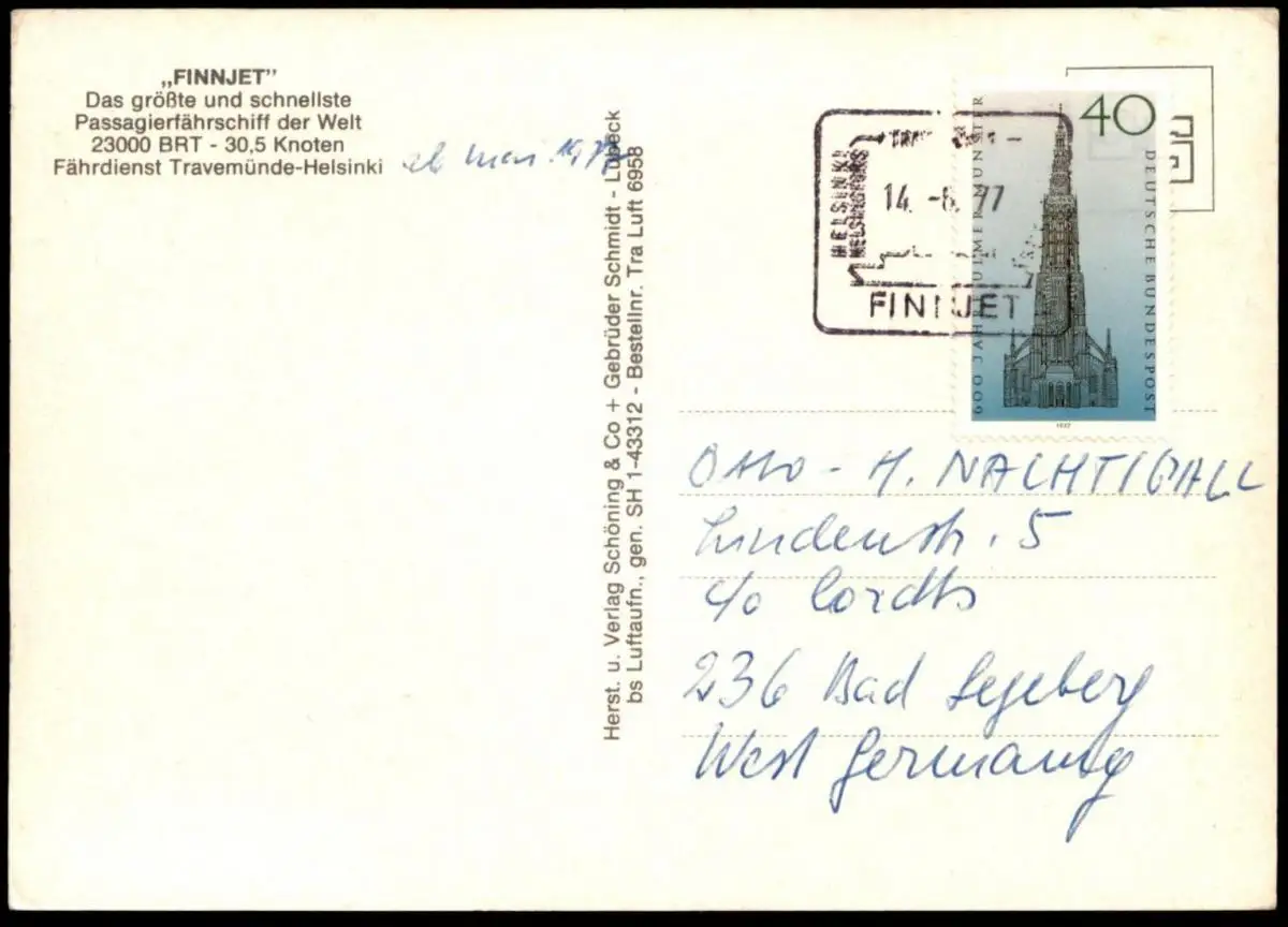 ÄLTERE POSTKARTE FÄHRE MS FINNJET SCHIFFSSTEMPEL FÄHRDIENST TRAVEMÜNDE HELSINKI ferry Schiff Motorschiff ship bateau AK
