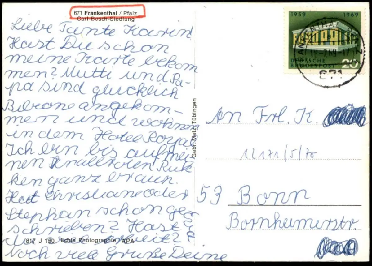 Gelaufen: 18.07.1969 mit Stempel Frankethal nach Bonn, Empfänger unkenntlich gemachtErhaltung (s. Scan): gut / 918586