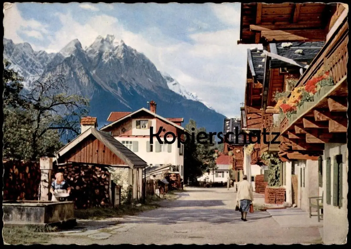 ÄLTERE POSTKARTE GARMISCH-PARTENKIRCHEN FRÜHLINGSSTRASSE GEGEN ZUGSPITZE FRAU AM BRUNNEN WASSER postcard Ansichtskarte