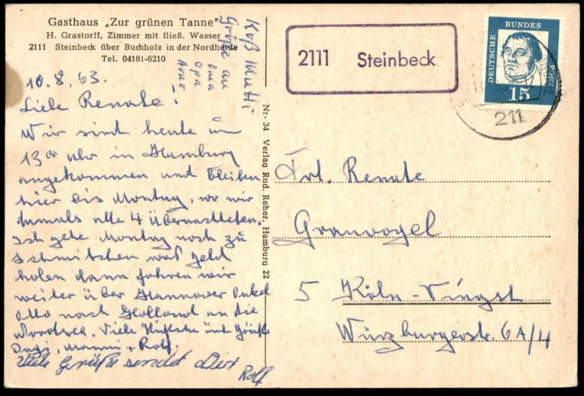 Gelaufen: 10.08.1963 mit Rechteckstempel Steinbeck nach Köln Vingst