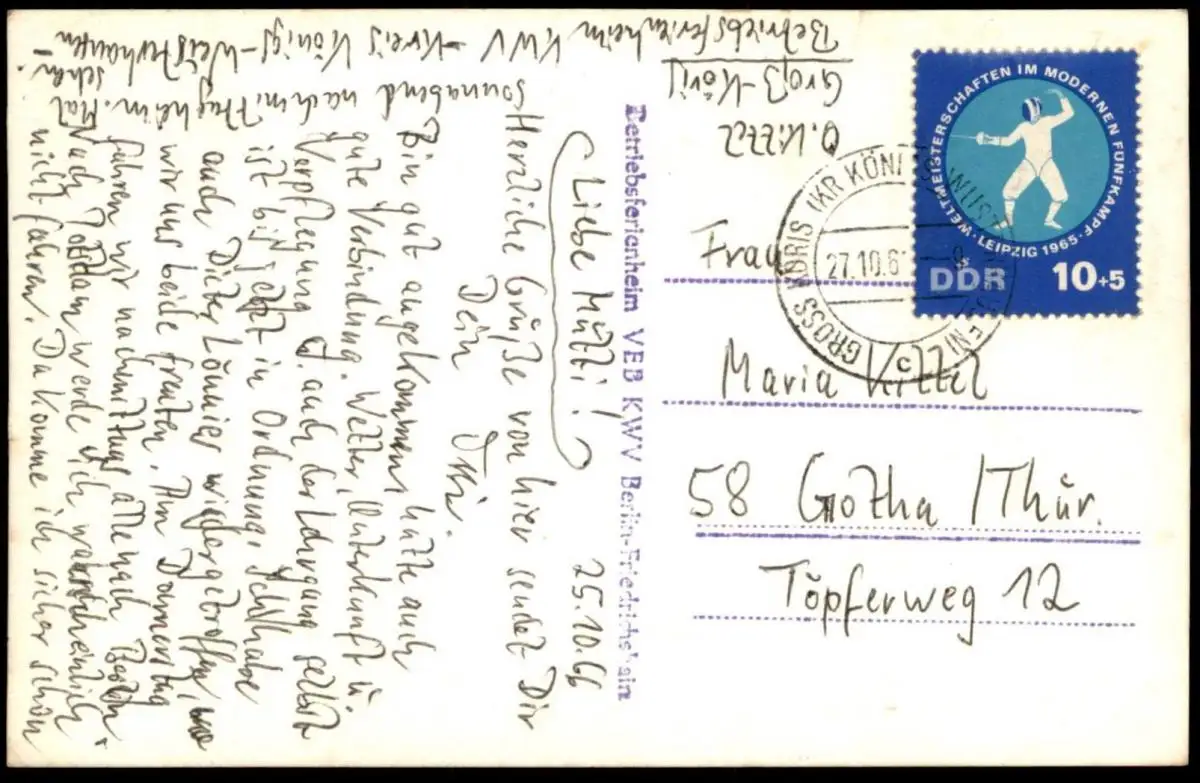 Gelaufen: 27.10.1966 mit Stempel Gross Köris & Briefmarke Weltmeisterschaften im modernen Fünfkampf Leipzig 1965 DDR Wohlfahrtsmarke, FechtenErhaltung (s. Scan): gut - sehr gut / 916767