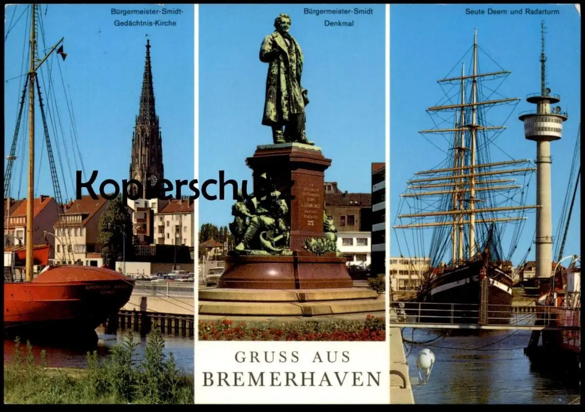 ÄLTERE POSTKARTE GRUSS AUS BREMER HAVEN GEDÄCHTNISKIRCHE SMIDT-DENKMAL RADARTURMVerlag: Bild-Druck Verlag GmbH, LübeckGelaufen: 28.08.1981 nach DortmundErhaltung (s. Scan): gut / 916848