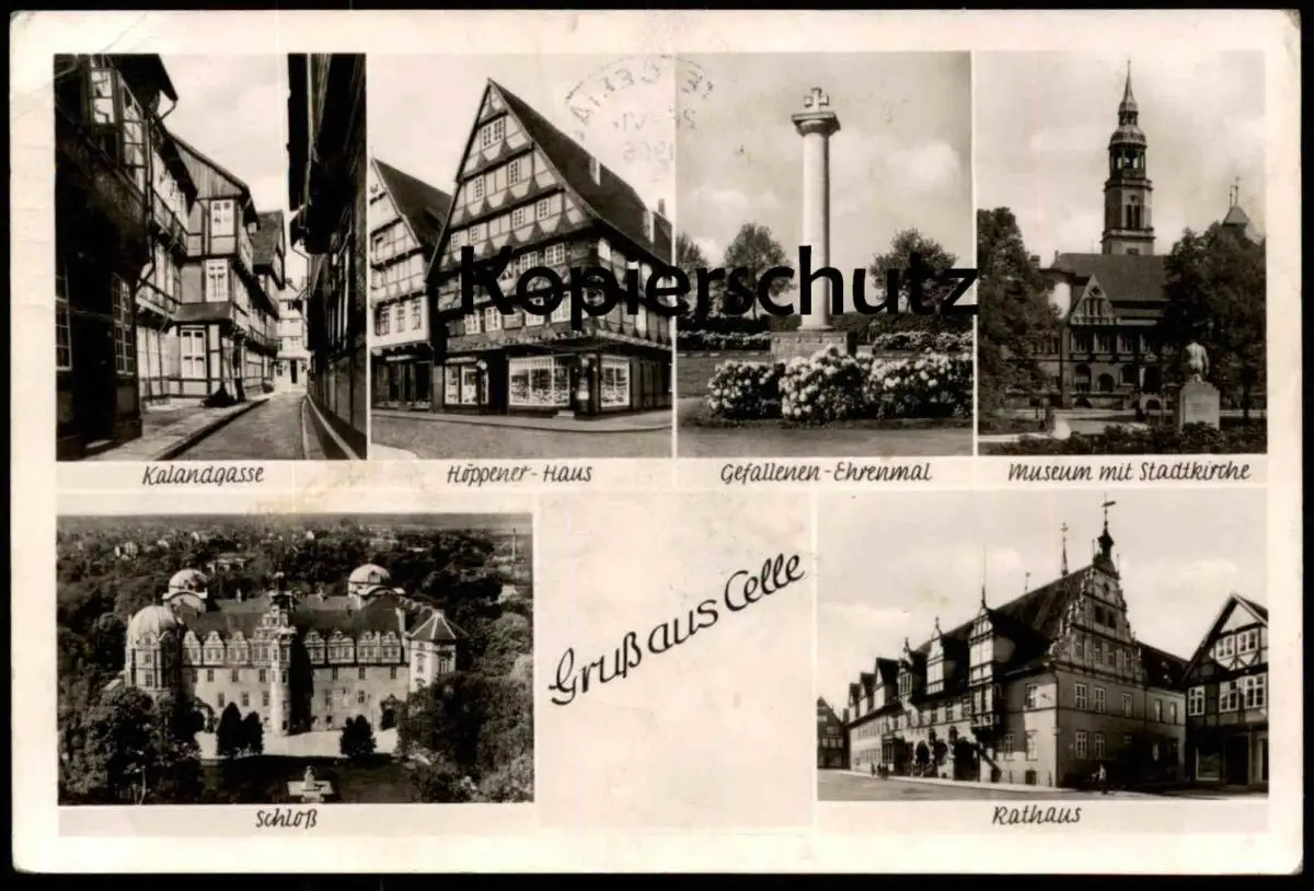 ÄLTERE POSTKARTE GRUSS AUS CELLE KALANDGASSE HÖPPENER HAUS GEFALLENEN EHRENMAL MUSEUM MIT STADTKIRCHE SCHLOSS RATHAUSVerlag: Schöning, LübeckGelaufen: 06.09.1954 mit Stempel Hannover 2 nach Gotha, Briefmarke (relativ sauber) entferntErhaltung (s. Scan): mittel, insgesamt etwas bestoßen / 916656