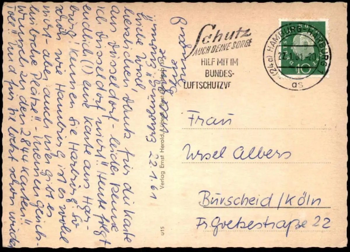 Gelaufen: 27.01.1961 mit Stempel Hamburg Harburg „Schutz auch Deine Sorge - Hilf mit im Bundes-Luftschutzverband“ nach Burscheid / Köln