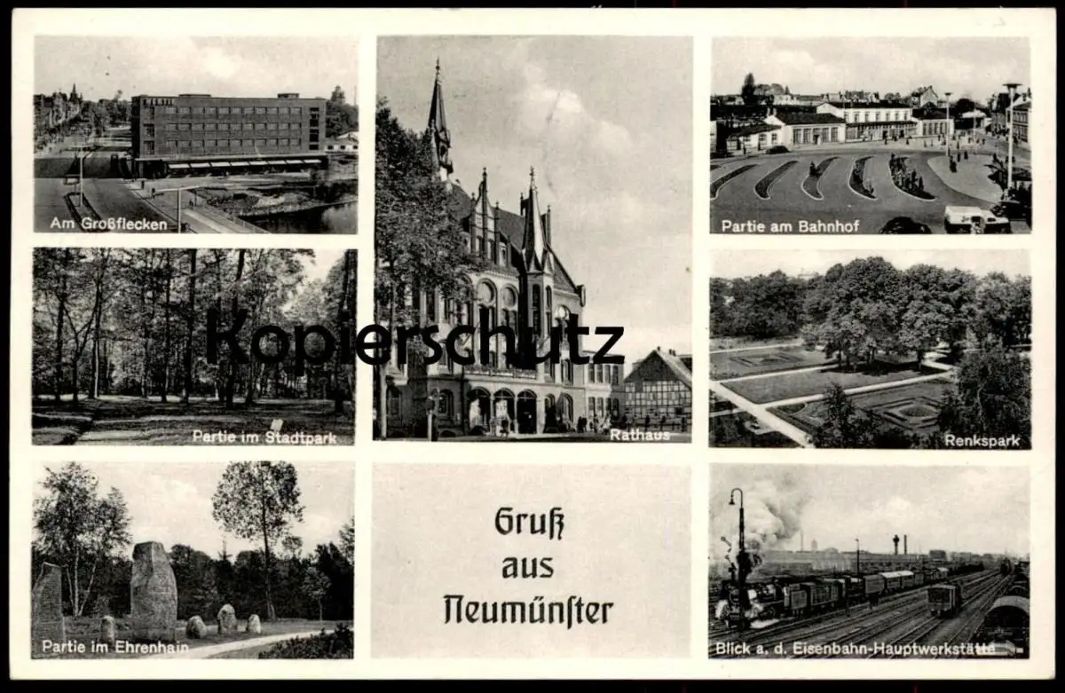 ÄLTERE POSTKARTE GRUSS AUS NEUMÜNSTER PARTIE AM BAHNHOF BLICK AUF DIE EISENBAHN-HAUPTWERKSTÄTTE RATHAUS RENKSPARK PARTIE IM STADTPARK AM GROSSFLECKEN PARTIE IM EHRENHAINVerlag: Johs. Bauer, Bordesholm
