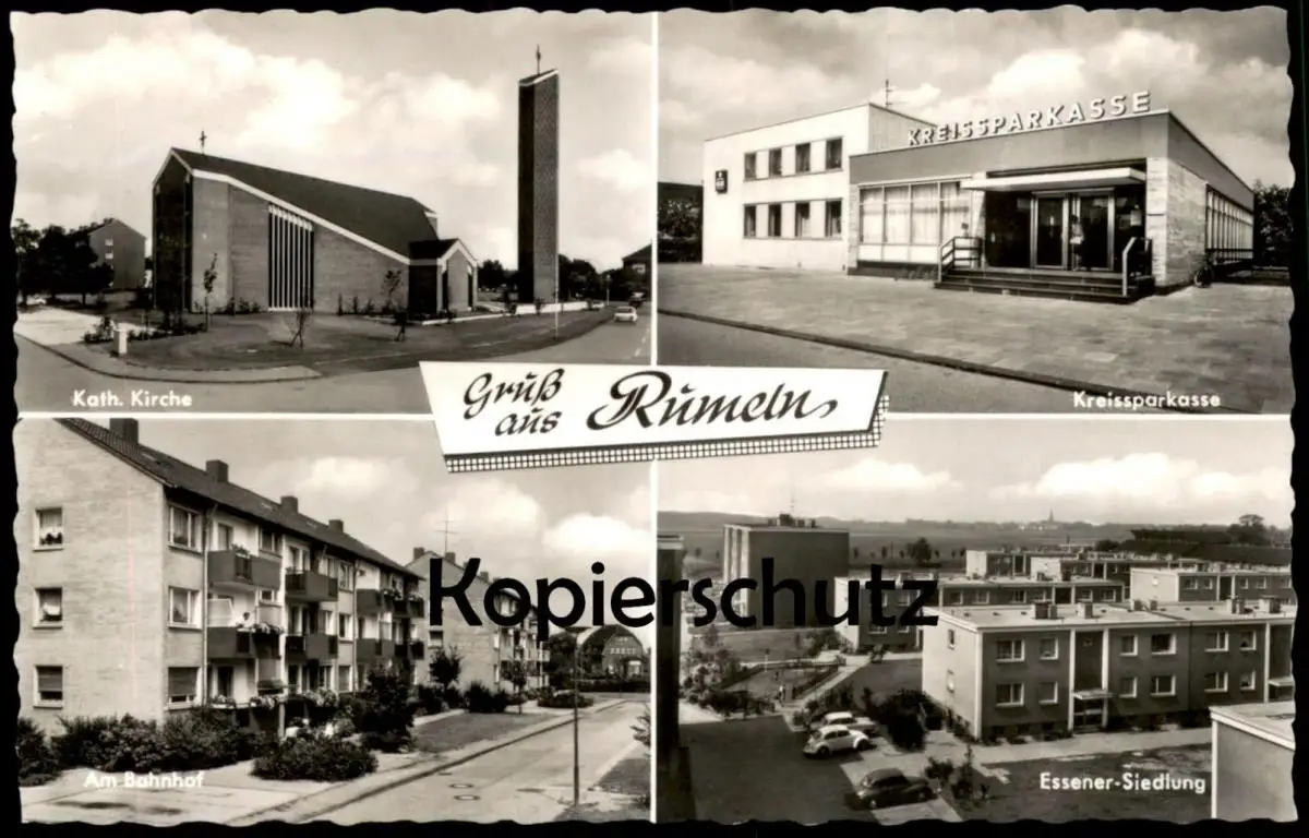 ÄLTERE POSTKARTE GRUSS AUS RUMELN KREISSPARKASSE AM BAHNHOF ESSENER SIEDLUNG KATHOLISCHE KIRCHE DUISBURG AK postcard