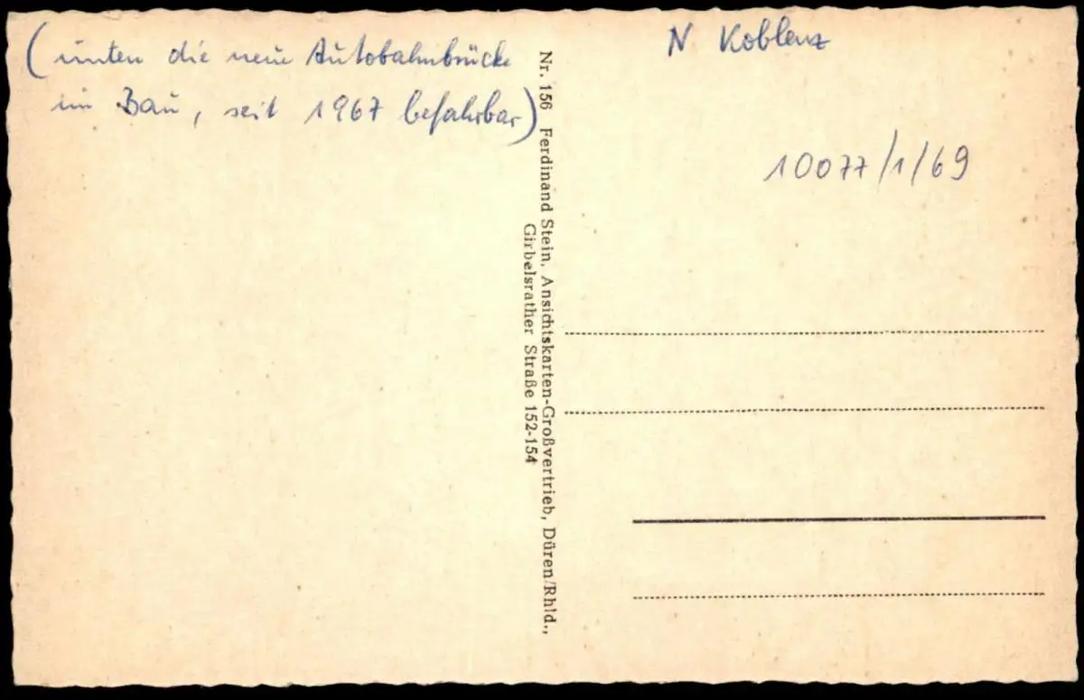 Verlag: Ferdinand Stein, Ansichtskarten-Großvertrieb, DürenGelaufen: nein, mit Hinweisen auf dei Autobahnbrücke im Bau (seit 1967 befahrbar) beschrieben