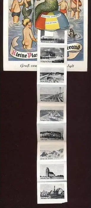 ÄLTERE POSTKARTE GRUSS VON SYLT NEPTUN KLEINE PLAUDEREI AM STRAND Fisch Kind enfant child Leporello carte a systeme cpa