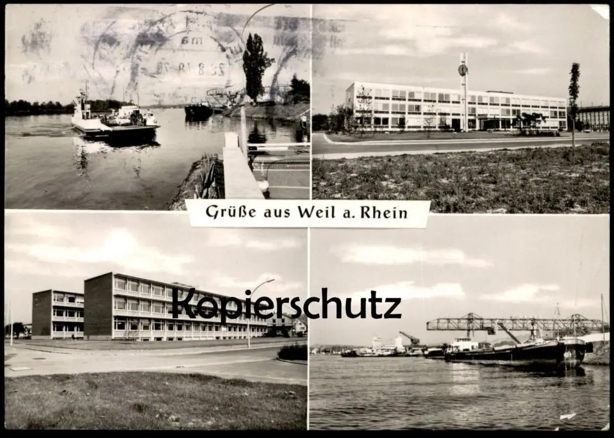ÄLTERE POSTKARTE GRÜSSE AUS WEIL AM RHEIN Fähre Frachtschiff cargo ship ferry Kran crane grue postcard Ansichtskarte