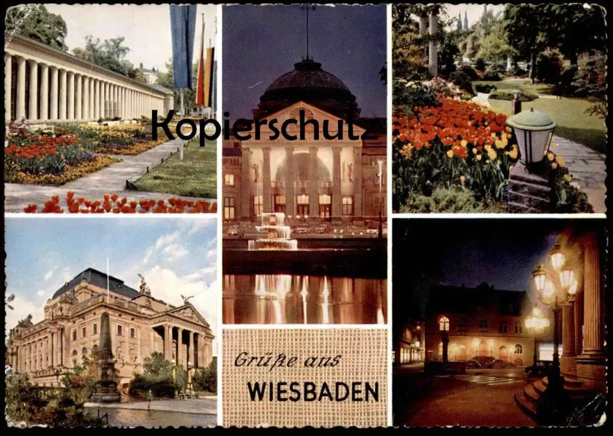 ÄLTERE POSTKARTE GRÜSSE AUS WIESBADEN BRUNNENKOLLONADE KURHAUS KURPARK THEATER ALTES RATHAUS DRUCKFEHLER cpa postcard