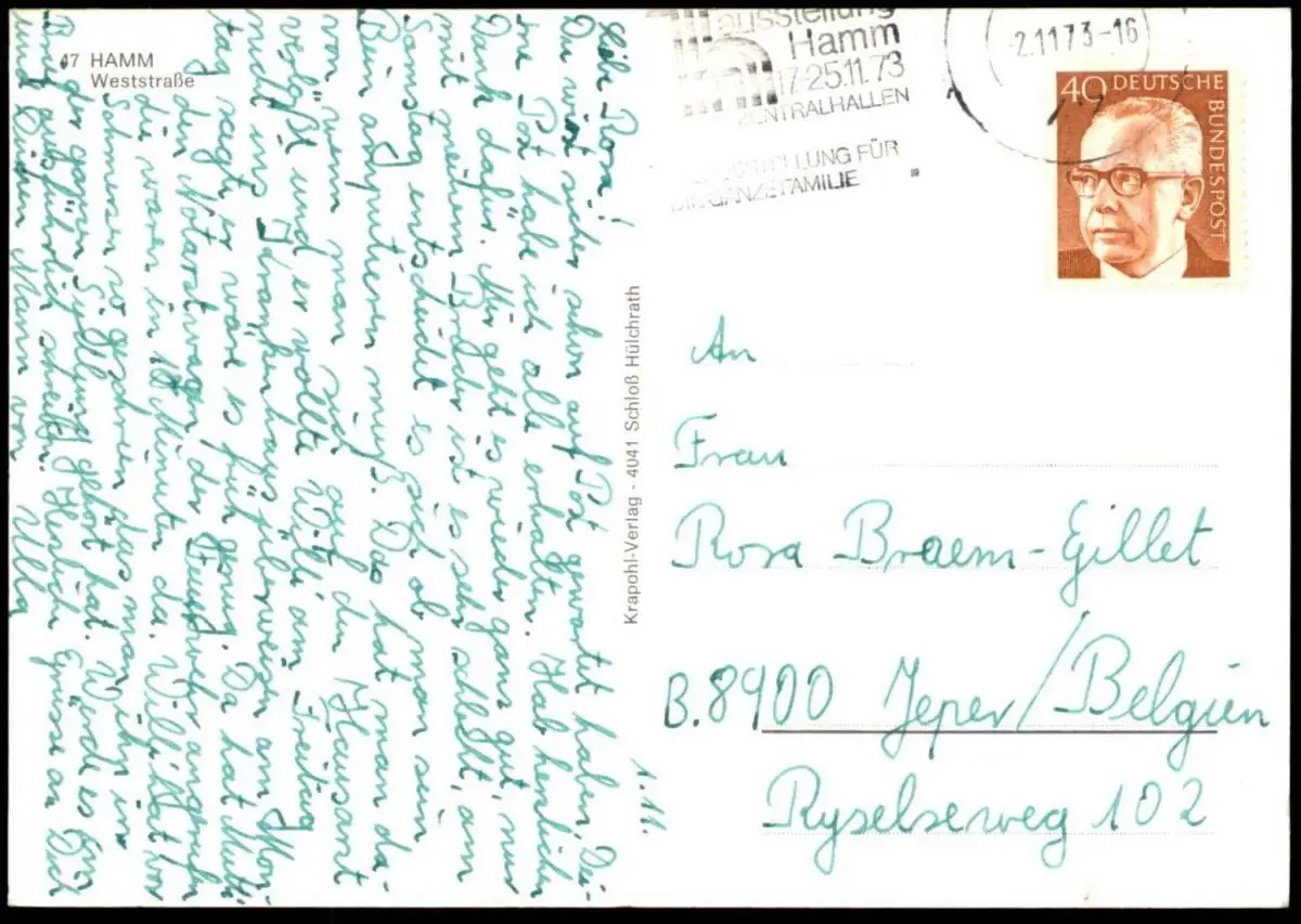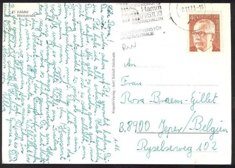 Gelaufen: 02.11.1973 mit Maschinenwerbestempel Ausstellung Hamm Zentralhallen nach Ieper Belgien YpernErhaltung (s. Scan): gut - sehr gut / 916188