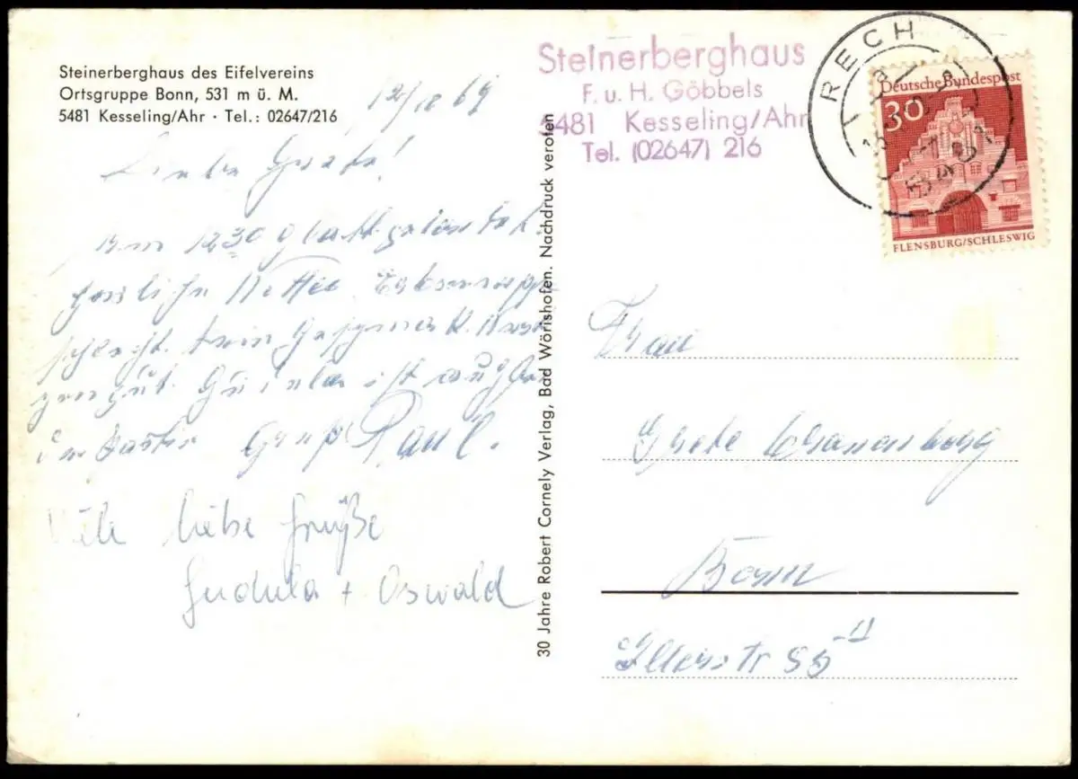 Gelaufen: 18.10.1969 mit Stempel Rech nach Bonn
