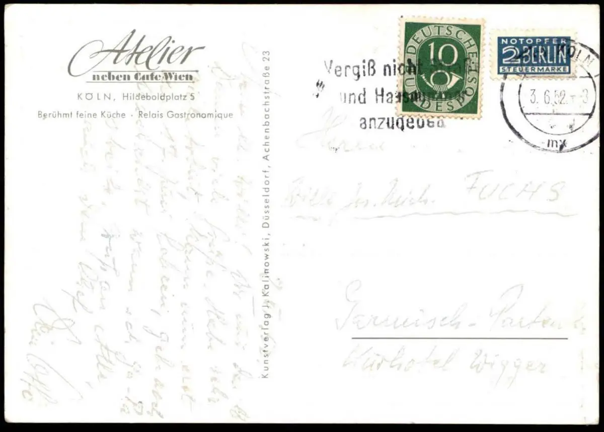 ÄLTERE POSTKARTE KÖLN RESTAURANT ATELIER HILDEBOLDPLATZ RELAIS GASTRONOMIQUE BERÜHMT FEINE KÜCHE NEBEN CAFE WIENVerlag: J. Kalinowski, Düsseldorf