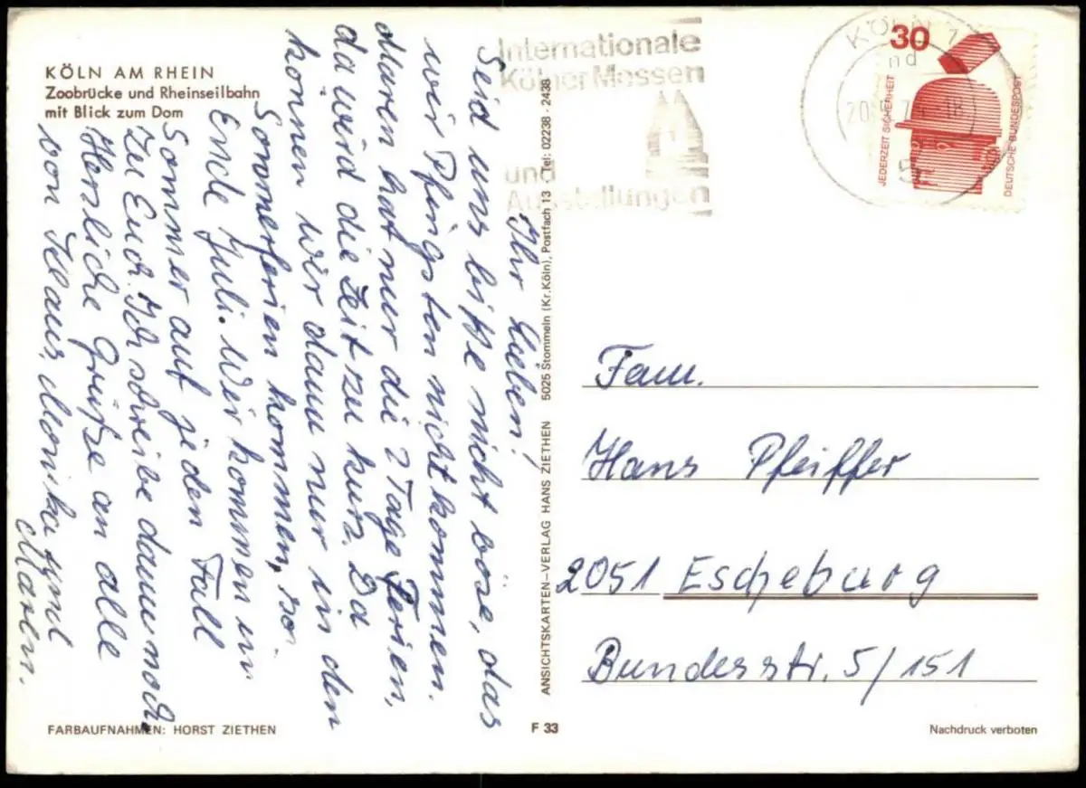 Gelaufen: 20.05.1974 mit Stempel Köln nach Escheburg