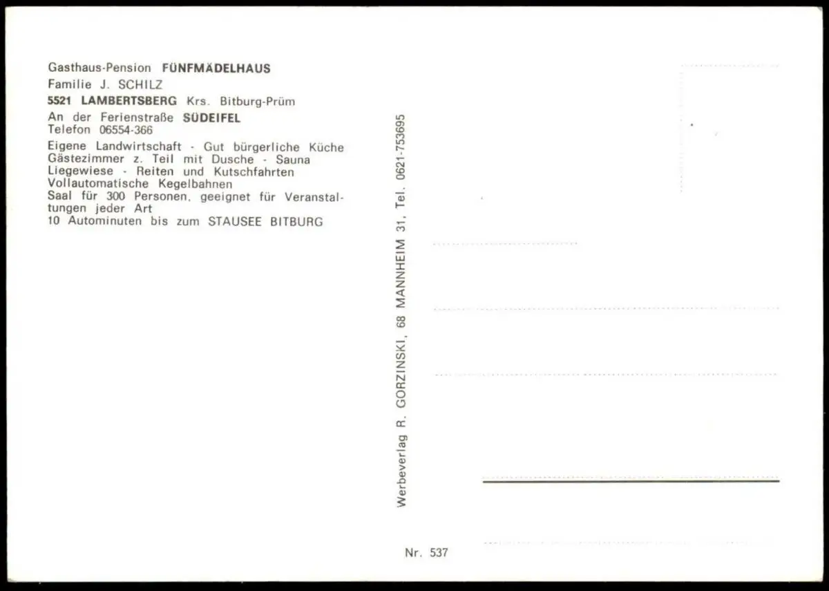 ÄLTERE POSTKARTE LAMBERTSBERG EIFEL FÜNFMÄDELHAUS J. SCHILZ KREIS BITBURG-PRÜM EIGENE LANDWIRTSCHAFT GÄSTEZIMMER ZUM TEIL MIT DUSCHE