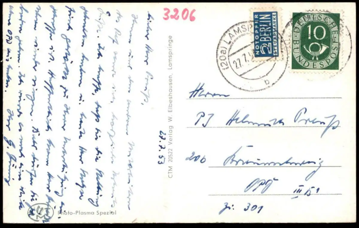 Gelaufen: 27.07.1953 mit Stempel Lamspringen nach Hamburg