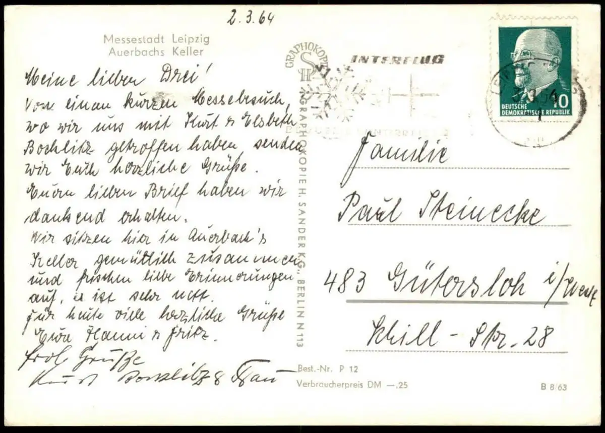 Gelaufen: 02.03.1964 mit Stempel Leipzig sowie Maschinenwerbestempel "Interflug Bequeme Winterreisen" nach Gütersloh