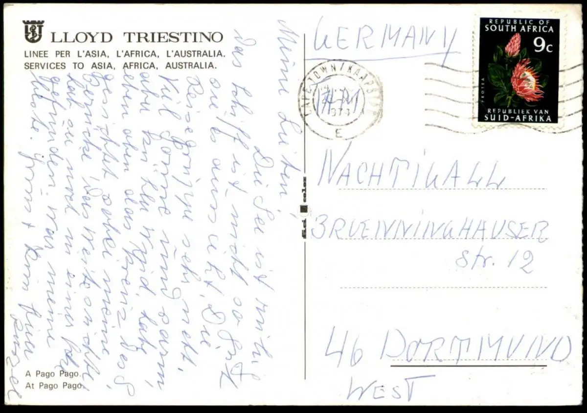 ÄLTERE POSTKARTE LLOYD TRIESTINO AT PAGO PAGO SERVICES TO ASIA AFRICA AUSTRALIA KREUZFAHRTSCHIFFVerlag: Hei. colorGelaufen: 14.xx.1974 mit Stempel Cape Town nach DortmundErhaltung (s. Scan): gut / 916180