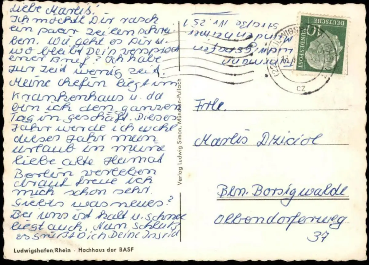 Gelaufen: 13.01.1959 mit Stempel Ludwigshafen nach Berlin Borsigwalde