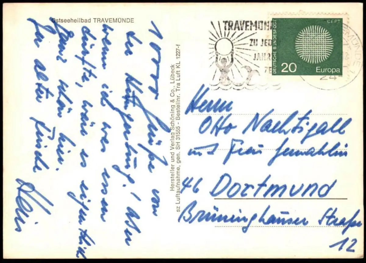 Gelaufen: xx.xx.19xx mit Stempel „Travemünde zu jeder Jahreszeit“ Motiv Meerjungfrau nach Dortmund